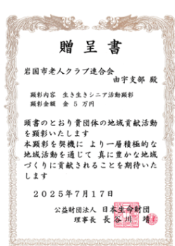 「児童・少年の健全育成助成」4団体、「生き生きシニア活動顕彰」4団体に日本生命山口支社支社長 山本様から「贈呈書」が交付されました。