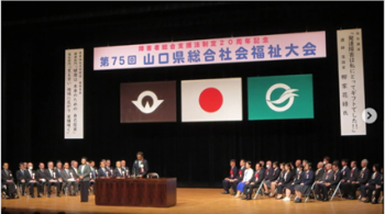 10月29日(水)サンビームやない(柳井市)にて、第75回山口県総合社会福祉大会が開催されました。本大会は、「住みたい地域で誰もが安心して心豊かに暮らし続けることができるまちづくり」を進めるため、県内の社会福祉関係者が一堂に会し、多年にわたり社会福祉の向上に尽力された方々を表彰し、敬意と感謝の意を表すことにより、山口県の社会福祉のより一層の発展に資することを目的としています。